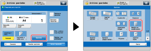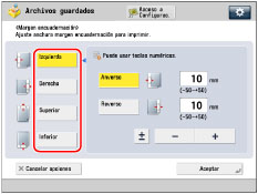 Pulse [Anverso] o [Reverso] → pulse [-] o [+] para establecer la anchura del margen de encuadernación → pulse [Aceptar].
