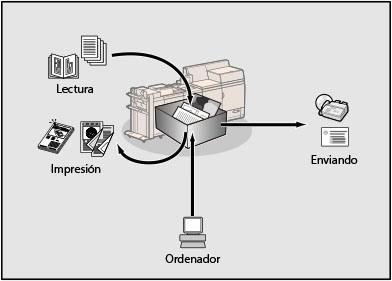 Permite a los usuarios guardar los archivos leídos con este equipo o los datos enviados desde un ordenador personal a través del controlador de la impresora. Puede imprimir el documento guardado siempre que sea necesario con las opciones que desee. También puede convertir el formato de archivo de los documentos a otro formato, como PDF, para enviarlos por correo electrónico con la función Enviar.