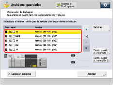 Si pulsa [Detalles], aparece la información detallada correspondiente al papel seleccionado. Si pulsa , puede cambiar si desea que se muestre la ilustración del dispositivo. Para más información, consulte "Cambiar la vista prefijada de la pantalla de lista de selección de papel ". |