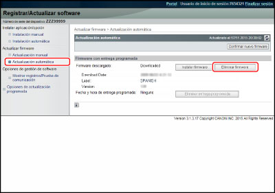 Haga clic en [Actualización automática] → [Eliminar firmware].