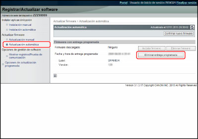 Pulse [Actualizar firmware] → [Eliminar entrega programada].