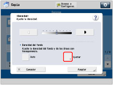 Si ajusta la densidad del fondo pulsando [Ajustar] para <Densidad del fondo>, la opción [Auto] se cancelará. De forma similar, si pulsa [Auto] mientras esté realizando ajustes manuales [Ajustar], sus ajustes se cancelarán. El equipo ajusta automáticamente la densidad para que coincida con el fondo. |