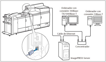 Esta sección describe la conexión de red con un cable LAN y opciones de red en el panel de control. Para obtener más información sobre las opciones de red consulte el manual de la imagePRESS Server. El paquete no incluye el cable de red. Deberá obtener un cable apropiado para el ordenador o la red pertinentes. Para obtener más información sobre la conexión póngase en contacto con distribuidor local Canon autorizado. |