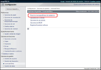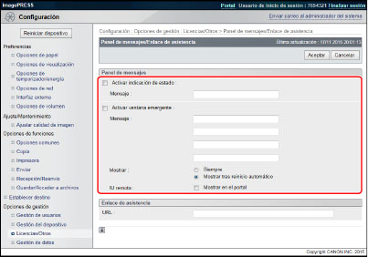Activar ventana emergente: | Seleccione esta opción para mostrar el panel de mensajes en la pantalla táctil como una ventana emergente. Si selecciona [Mostrar en el portal], el panel de mensajes se muestra en la página del portal de la IU remota. |
