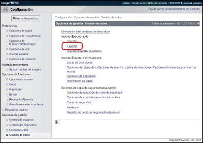Durante la operación Exportar todo, la IU remota no podrá utilizarse para realizar operaciones (Monitor estado/Cancelar, Configuración, Archivos recibidos/guardados, Libreta de direcciones). |