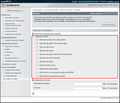 Si importa las opciones de gestión de ID de departamentos utilizando la función Importar todo, las opciones información administrador sistema como un ID o contraseña se sobrescribirán. Compruebe la información del administrador del sistema del equipo para exportación antes de utilizar la función Exportar todo, ya que se requiere para iniciar sesión en el equipo de destino para importación. La función Exportar todo no estará disponible en las situaciones siguientes: Al ejecutar/esperar por cualquier trabajo (envío, reenvío, recepción de i-fax, impresión de informes, funciones especificadas por el modo Envío diferido) Durante una operación de Importar/Exportar individualmente Al ver la libreta de direcciones utilizando la IU remota desde otra serie imagePRESS Al entregar información de dispositivos Mientras esté ocurriendo un error Copia de seguridad de datos de buzón |