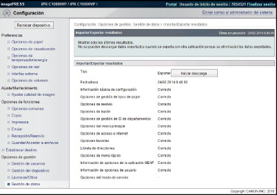 La pantalla resultados de importación/exportación no podrá mostrarse hasta que finalice la exportación. Si hace clic en [Iniciar descarga] , podrá descargar los archivos de exportación. Puede comprobar los resultados de la importación/exportación más reciente pulsando [Gestión de datos] para <Opciones de gestión> → [Importar/Exportar resultados]. |