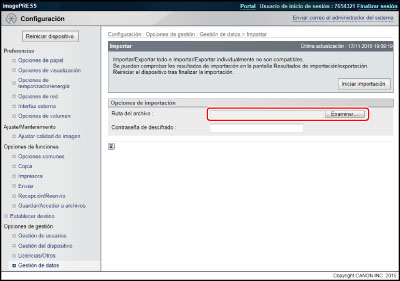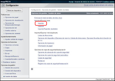 Si importa las opciones de gestión de ID de departamentos utilizando la función Importar todo, las opciones información administrador sistema como un ID o contraseña se sobrescribirán. Compruebe la información del administrador del sistema del equipo para exportación antes de utilizar la función Exportar todo, ya que se requiere para iniciar sesión en el equipo de destino para importación.