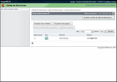 Las operaciones de gestión de libretas de direcciones a través de la IU remota son las mismas que a las que se puede acceder desde [Establecer destino] (Configuración) en el panel de control del equipo. |