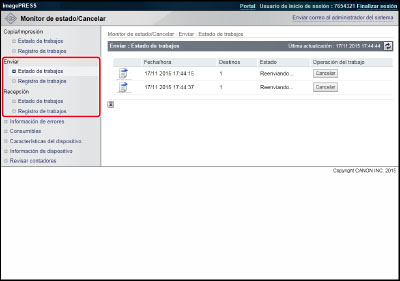 Haga clic en [Estado de trabajos] → haga clic en [Cancelar] para el trabajo que quiere eliminar.