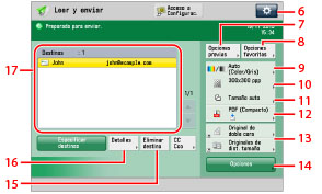 14 | [Opciones] Se pulsa para seleccionar y utilizar otros modos disponibles para leer y enviar. Configure funciones de envío útiles, como enviar juntos originales de distinto tamaño o enviar originales de doble cara. |
