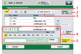4 | Botón Buscar letra inicial Pulse las teclas alfanuméricas (por ejemplo, [ABC]) para que aparezcan las teclas individuales correspondientes a cada letra o número. Puede seleccionar una letra o número para limitar el intervalo de caracteres. Pulse [Todo] para volver a la lista completa de direcciones. |