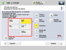 Puede seleccionar opciones adicionales si envía en el formato PDF, XPS o OOXML. Consulte las siguientes instrucciones acerca de cómo configurar cada tipo de PDF, XPS, o OOXML: [Trazar y suavizar]: Trazar y suavizar [Compacto]: PDF o XPS compactos [Color limitado]: PDF de color limitado [OCR (texto búsquedas)]: PDF/XPS/OOXML con búsqueda [Agregar firmas digit.]: Agregar una firma digital a un PDF o XPS [Cifrar]: Cifrar archivos PDF |