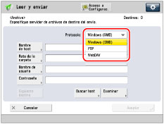 Nombre de host | Un nombre de host es un nombre que se asigna a un ordenador host que proporciona servicios en la red. En este cuadro de entrada, introduzca el nombre del servidor de archivos de la red como destino del trabajo de envío. Si selecciona [FTP] o [WebDAV] como protocolo de servidor, también puede especificar un número de puerto después de la dirección del nombre de host introduciendo dos puntos (:) seguidos del número de puerto. Ejemplo: 192.168.100.50:21000 En el envío a un host IPv6, especifique las siguientes opciones para [Nombre de host]: [Dirección IPv6]: <Número de puerto> Ejemplo: [5aed:90a0:bc05:01d2:568a:2fc0:0001:12ee]:21000 Asegúrese de introducir el mismo número de puerto para el nombre de host que el especificado para el servidor FTP o el servidor WebDAV al cual desea enviar los documentos. |
