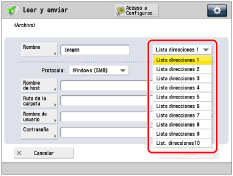 Si activa la opción [Activar/Desactivar cambio de idioma/teclado], es posible que no aparezcan correctamente el nombre de host y la ruta de la carpeta del destino del servidor de archivos, por lo que no podrá consultarlos. (Consulte "Activar el cambio de idioma/teclado".) |