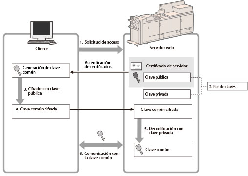Puede lograr una comunicación cifrada segura cuando el usuario accede al equipo a través de un navegador web instalando un certificado de servidor en el equipo. Con la comunicación TLS, mediante el certificado de usuario y la clave pública se genera una clave común que solo el usuario y el equipo pueden utilizar. De esta manera se puede impedir la intercepción y el robo de datos. Consulte