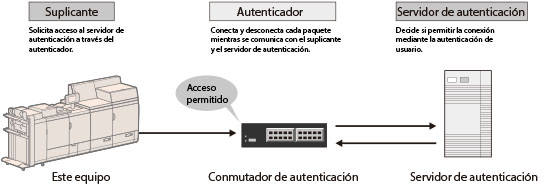 Gestiona toda la información de autenticación a través del servidor de autenticación (RADIUS: Remote Authentication Dial In User Service) y autentica al solicitante. Puede impedir el acceso no autorizado, ya que únicamente el solicitante autenticado por el servidor RADIUS tiene permiso para conectarse a la red por parte del autenticador.