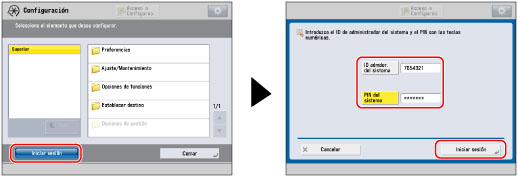 Cerciórese de no olvidar el PIN admdor. del sistema. Si olvidó el PIN admdor. del sistema, consulte a su distribuidor local Canon autorizado. Si está utilizando Gestión de ID de departamentos, las operaciones que pueden llevar a cabo los usuarios generales en la pantalla Configuración están restringidas. Para poder utilizar todos los elementos de la pantalla Configuración, introduzca un ID de administrador del sistema y un PIN del sistema para iniciar sesión como administrador. Para información acerca de los elementos de Configuración disponibles con privilegios de administrador, consulte "Tabla de opciones para administradores disponibles (pantalla táctil)" y "Tabla de opciones de administrador disponibles (IU remota)". |