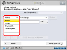 [Comienza por]: | El resultado debe empezar por las mismas letras que el nombre, la dirección de correo electrónico, la organización o la unidad de organización que se haya introducido. |