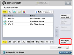 Si selecciona [Todas listas dir.] en la lista desplegable Libreta de direcciones, se muestran los destinos guardados en las teclas de acceso rápido. Sin embargo, los destinos guardados en las teclas de acceso rápido no pueden editarse. Para conocer las instrucciones sobre cómo guardar y editar las teclas de acceso rápido, consulte