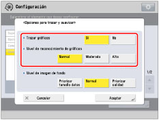 Si aumenta <Nivel de reconocimiento de gráficos>, también aumenta el tamaño de los datos. Se recomienda utilizar primero [Normal], si no se obtienen los datos deseados, intentar aumentar el nivel de reconocimiento a [Moderado] o [Alto]. |
