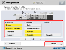 Puede designar una bandeja de salida para múltiples funciones. El orden de prioridad de los destinos de salida viene determinado por el orden de las bandejas de salida seleccionadas. La prioridad se muestra con "1" y "2". Si el modo Alto volumen de apilamiento está ajustado en "On", el orden de emisión de la bandeja B se ajusta en "1", por lo que la prioridad a la bandeja B no puede cambiarse. Sin embargo, si el orden de emisión para la bandeja C está ajustado en "1" cuando está instalado el Apilador de Alta Capacidad H, se da prioridad a la bandeja C. (Consulte "Modo Alto volumen de apilamiento".) |