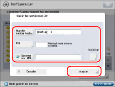 Si establece el equipo para enviar un enlace mediante e-mail al buzón de fax confidencial en el que está guardado el documento, puede comprobar o realizar operaciones en el documento del buzón de fax confidencial con la IU (interfaz de usuario) remota del equipo. Si desea enviar un enlace a un buzón de fax confidencial mediante e-mail, pulse [Opciones env. URL] → especifique el destino → pulse [Aceptar].