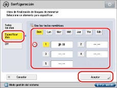 Si selecciona [Especificar días], seleccione un día de la semana ([Dom] a [Sáb]) → seleccione un número ([1] a [5]).