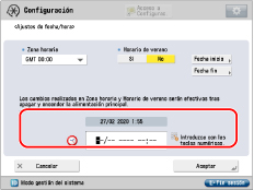 Pulse [Fecha fin] → seleccione el mes, día y hora en que finaliza el horario de verano → pulse [Aceptar].