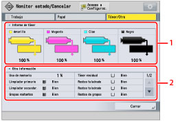 La información correspondiente a la cantidad de tóner restante se muestra en la parte superior, y otra información se muestra en la parte inferior de la pantalla Tóner/Otro.