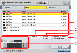 5 | Ilustración de dispositivos de información de orígenes de papel Una ilustración muestra la información de todos los orígenes de papel del equipo. Cada origen de papel tiene asignado un número exclusivo. El origen de papel en el que esté cargando actualmente papel estará resaltado en amarillo. |