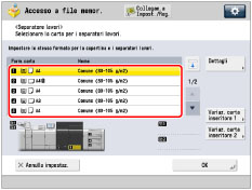 Se si preme [Dettagli], vengono visualizzate informazioni dettagliate sulla carta selezionata. Se si preme , è possibile selezionare se visualizzare l'illustrazione della periferica. Per ulteriori informazioni, vedere "Modifica della schermata predefinita dello schermo di elenco Selezione carta ". |