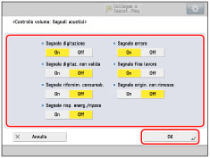 sul pannello comandi, è possibile impostare vari segnali da far emettere, in funzione delle operazioni eseguite o dello stato della periferica.Segnale digitazione: | Quando si premono i tasti sul pannello comandi o sul pannello digitale. |