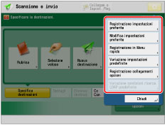 Per informazioni sulle schermate che possono essere impostate dopo l'avvio della macchina, vedere "Schermata predefinita dopo avvio/ripristino". Le impostazioni da specificare possono variare in base ai privilegi dell'utente. Per maggiori informazioni sulla registrazione e la modifica delle Impostazioni preferite, vedere di seguito: Registrazione/modifica/eliminazione dei pulsanti Impostazioni preferite per la Scansione e invio Registrazione/modifica delle impostazioni preferite per Accesso a file memorizzati Registrazione/modifica delle impostazioni preferite per la Scansione e memorizzazione Per maggiori informazioni sulla registrazione di tasti di selezione veloce per le Opzioni e le Impostazioni preferite, vedere di seguito: Registrazione dei tasti di selezione veloce per la Copia Registrazione dei tasti di selezione veloce per la Scansione e invio |