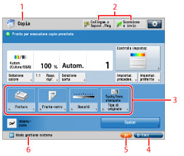 6. | In questa schermata vengono visualizzati i lavori e le operazioni di copiatura in corso nonché lo stato delle periferiche e dei materiali di consumo. Inoltre, se si imposta la Gestione ID divisione, è visualizzato l'ID divisione usato per accedere alla macchina. |