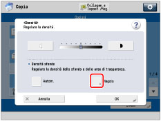 Se si regola la densità dello sfondo premendo [Regola] per <Densità sfondo>, l'impostazione [Autom.] viene annullata. Allo stesso modo, se si preme [Autom.] mentre si effettuano regolazioni manuali in [Regola], le regolazioni vengono annullate. La macchina regola automaticamente la densità in base allo sfondo. |