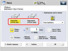 Per informazioni sui prodotti opzionali, vedere gli argomenti seguenti: Finisher-AN/Saddle Finisher-AN con pinzatura a sella/Puncher Unit-BS/Puncher Unit-BT/Puncher Unit-BU Se [Finitura] non è impostato, i fogli vengono stampati con le stesse modalità utilizzate quando è impostato [Raggruppam. (stesse pagg)]. Se [Fascicolazione automatica] è impostato su 'On', verranno impostati automaticamente i modi Fascicolazione o Sfalsamento Fascicolazione quando si posizionano gli originali nell'alimentatore. (Vedere "Attivazione della fascicolazione automatica".) È possibile visualizzare le informazioni dettagliate della carta selezionata premendo [Dettagli]. |