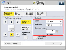 Le prestazioni di stampa potrebbero non essere ottimali, a seconda del contenuto originale e della combinazione di impostazioni. Se si utilizza [Numerazione pagine] con [Aggiunta copertina] o [Inserimento fogli], i numeri non verranno stampati sulle pagine inserite. |
