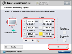 Utilizzando i due valori numerici e "c = 250,0", una periferica regola la lunghezza per correggere la distorsione dell'area di stampa.