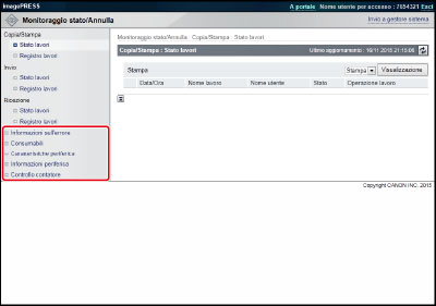 Informazioni periferica: | Visualizza le informazioni relative alla macchina, ad esempio le informazioni sull'amministratore e la posizione di installazione della macchina. |