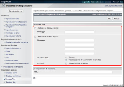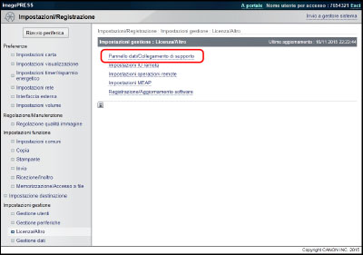 Fare clic su [Impostazioni/Registrazione] → selezionare [Licenza/Altro] dal menu visualizzato in Impostazioni gestione → fare clic su [Pannello dati/Collegamento di supporto].