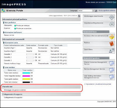 Il Pannello dati è una funzione utilizzata dall'amministratore per trasmettere messaggi agli utenti della macchina visualizzandoli nella IU remota o sul pannello digitale. Le impostazioni del Pannello dati e la creazione dei messaggi vengono effettuate dalla IU remota.