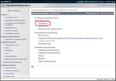 Se si importano le Impostazioni gestione ID divisione quando si utilizza la funzione Importa tutti, le impostazioni delle informazioni del gestore di sistema, come l'ID e la password, sono sovrascritte. Controllare le informazioni del gestore di sistema sulla macchina di esportazione prima di utilizzare la funzione Esporta tutti, poiché sono richieste quando si accede alla macchina di destinazione per l'importazione. La funzione Importa tutti non è disponibile nelle seguenti situazioni: Esecuzione/attesa di qualsiasi lavoro (invio, inoltro, ricezione di i-fax, stampa di rapporti, funzioni specificate dal modo Invio differito) Durante un'operazione di Importa/Esporta individualmente Visualizzazione della rubrica mediante la IU remota da un'altra serie imagePRESS Distribuzione delle informazioni sulla periferica Mentre si verifica un errore Backup dei dati delle mailbox |