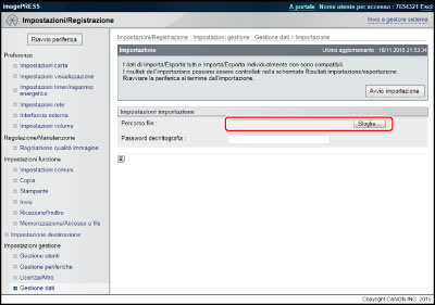Per abilitare le impostazioni importate è necessario riavviare la macchina. Dopo l'importazione, non sarà possibile utilizzare l'IU remota per eseguire altre operazioni sino al riavvio della macchina. Spegnere e riaccendere la macchina con l'interruttore principale. (Vedere "Alimentazione principale e tasto risparmio energetico".) |