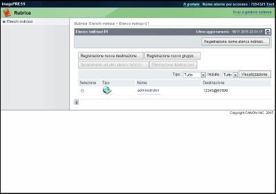 Le operazioni di gestione della rubrica disponibili mediante l'IU remota sono uguali a quelle ottenute con la selezione della schermata [Impostazione destinazione] (Impostazioni/Registrazione) nel pannello comandi. |