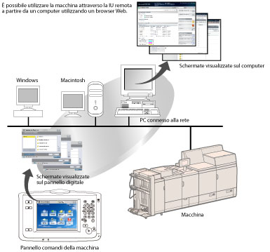 La IU remota consente di mettere in pausa e riprendere un processo, eseguire operazioni sui processi nella Mailbox RX memoria o nelle Mailbox fax riservati e specificare diverse impostazioni. Permette inoltre di impostare e utilizzare la macchina da un computer, invece di utilizzare il pannello comandi della macchina.