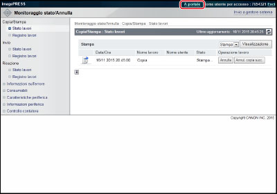 Per tornare alla pagina iniziale, fare clic su [A portale]. Verranno visualizzate informazioni quali lo stato della macchina o il nome del prodotto.
