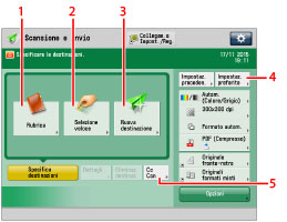 Il numero massimo di destinazioni che è possibile specificare e a cui è possibile inviare in una sola volta è pari a 256. Se si specifica un gruppo di indirizzi per la destinazione, ciascun indirizzo di quel gruppo viene contato come una destinazione. Di seguito viene indicato il significato delle icone che vengono visualizzate sulla schermata: : E-mail : I-fax : File : Gruppo : Mailbox : Ccn : Cc |