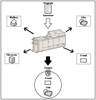 Per poter inviare i documenti acquisiti ad un indirizzo e-mail, ad un indirizzo I-fax oppure ad un file server, si devono configurare le impostazioni della rete. (Vedere "Impostazioni di comunicazione comuni per e-mail/I-Fax".) |