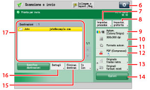 8 | [Impostaz. preferite] Premere questo tasto per registrare le impostazioni di invio utilizzate frequentemente. Le impostazioni registrate possono essere richiamate in un secondo momento. |